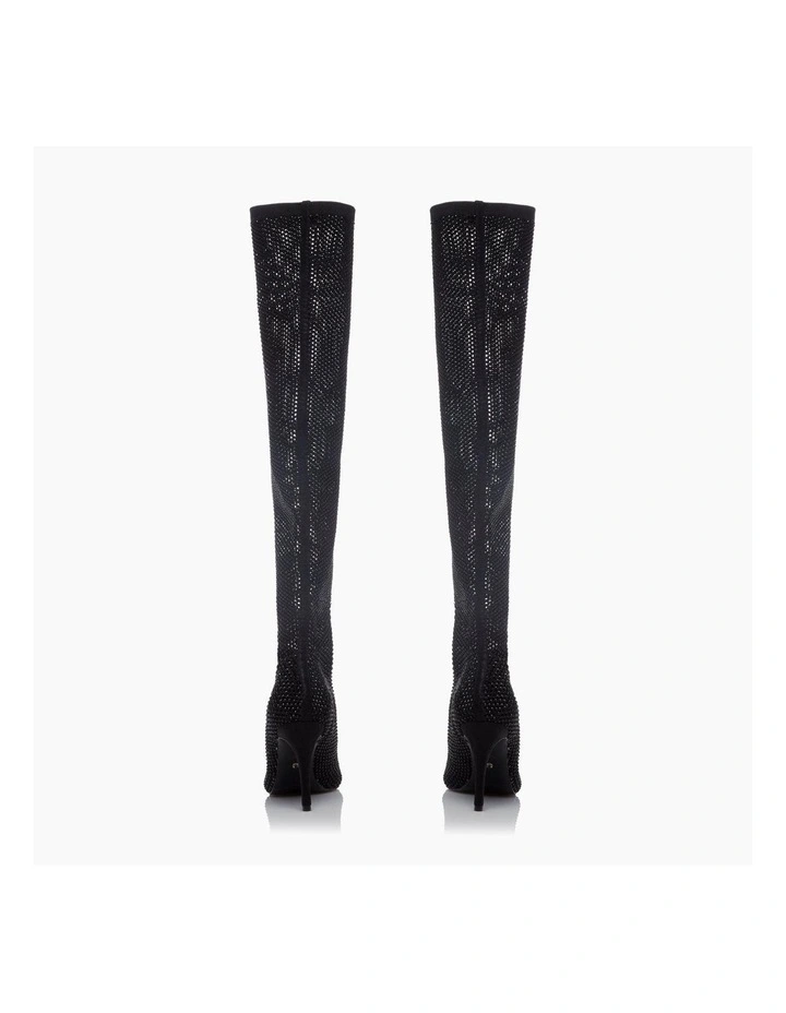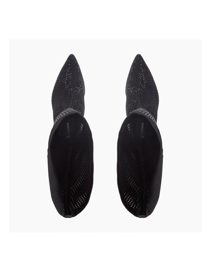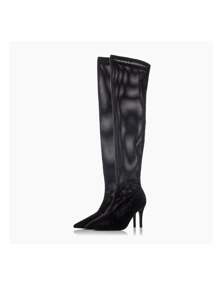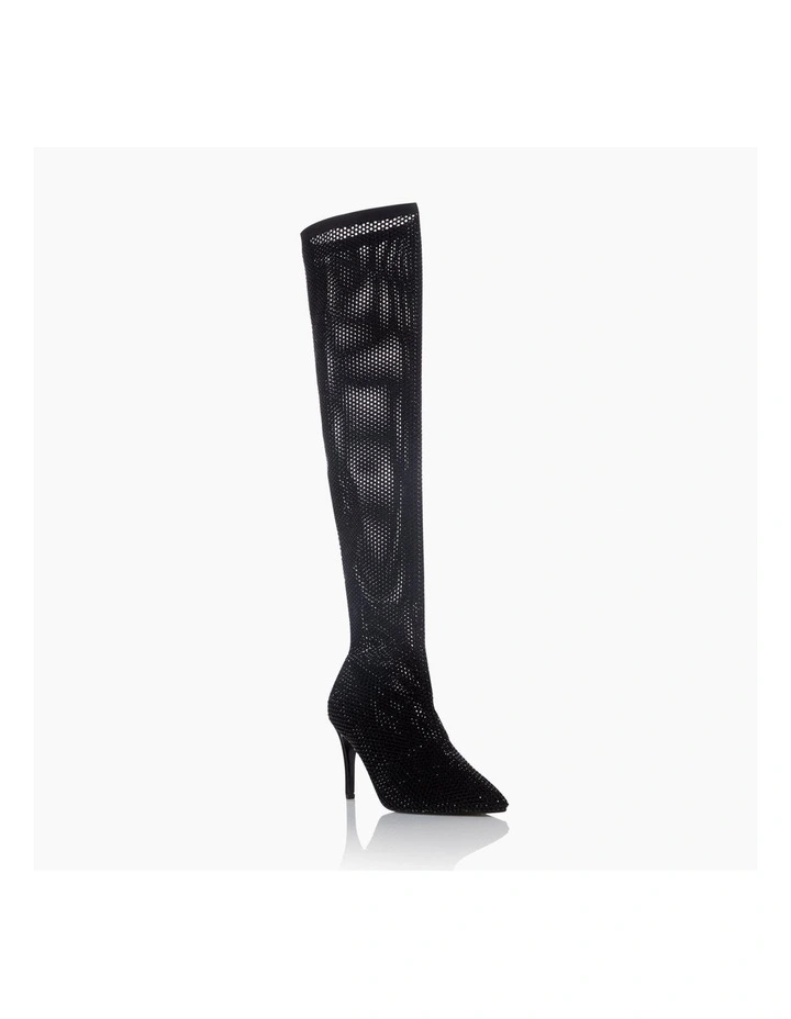 The Sacramentie boots will be your go-to style for the party season. The hot fix diamante embellishment rests on a fish net mesh fabric. Complete with a pointed toe and stiletto heel.